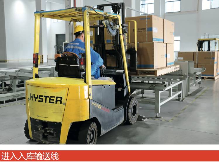 基地外由其他廠區生產的產品則直接以帶托運輸的方式被運送到基地,由叉車搬運至一樓入庫作業區后根據系統上貨指令將托盤貨物放置在輸送線上。